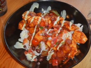 Smoke in a Bowl (Agave BBQ chicken, peppers, onions, pineapple, black bean salsa, cilantro you, jasmine rice)